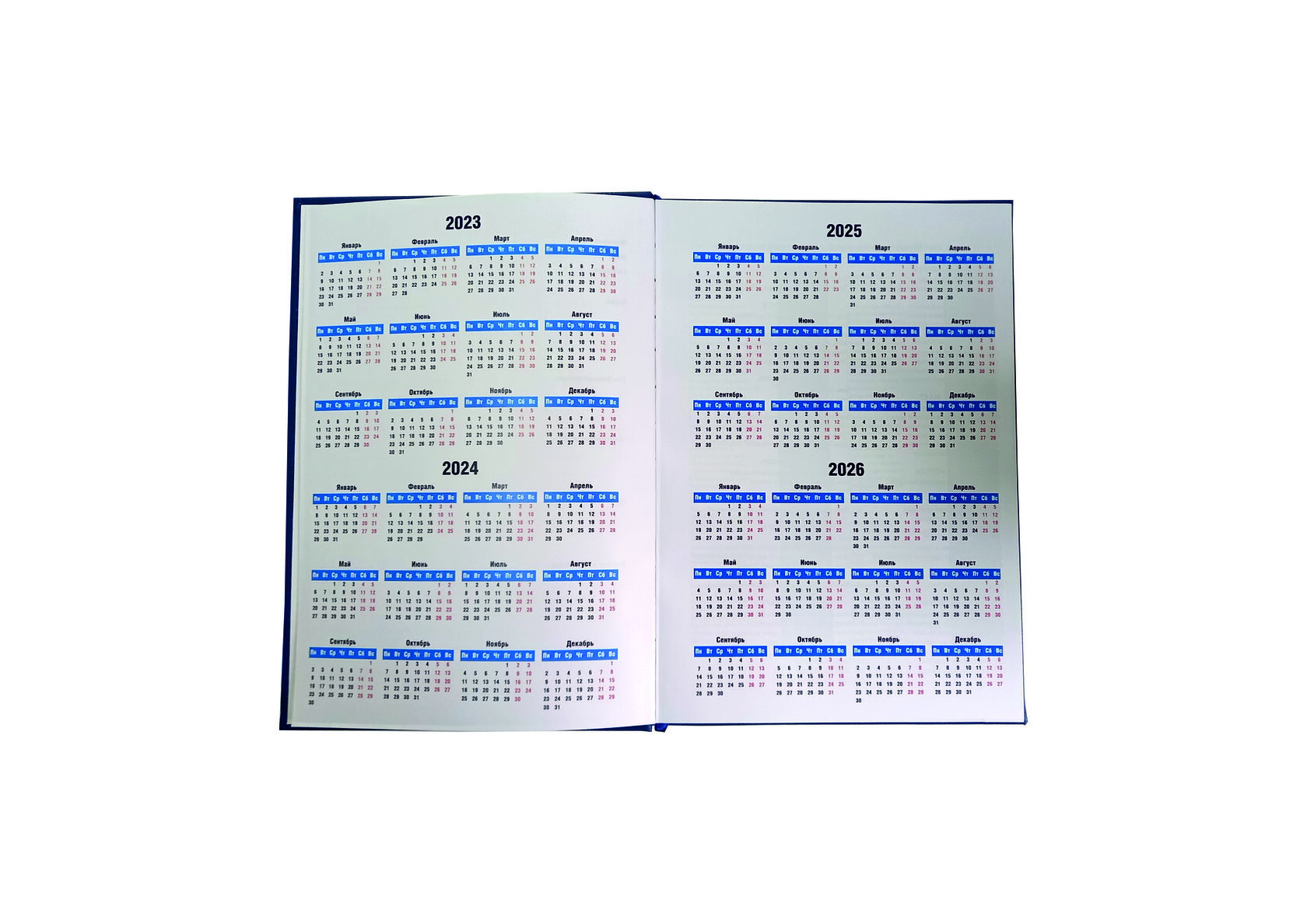 Ежедневник выполнен из качественных материалов по современным технологиям. Обложка ежедневника сделана из искусственной кожи софт-тач с отстрочкой по периметру нитками синего цвета. Размер 147 x 214 мм. Блок состоит из 256 страниц белого цвета с черной графикой А5 формата. Бумага офсетная 70 г/м2, без скругления углов, без перфорации. Имеет информационно-справочный раздел. Каптал и атласное ляссе синего цвета.