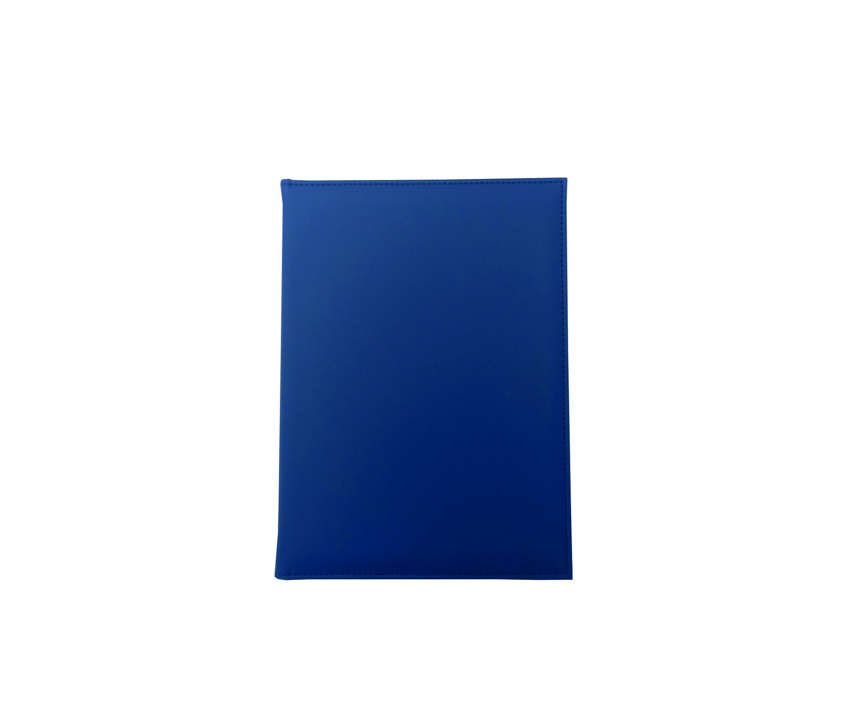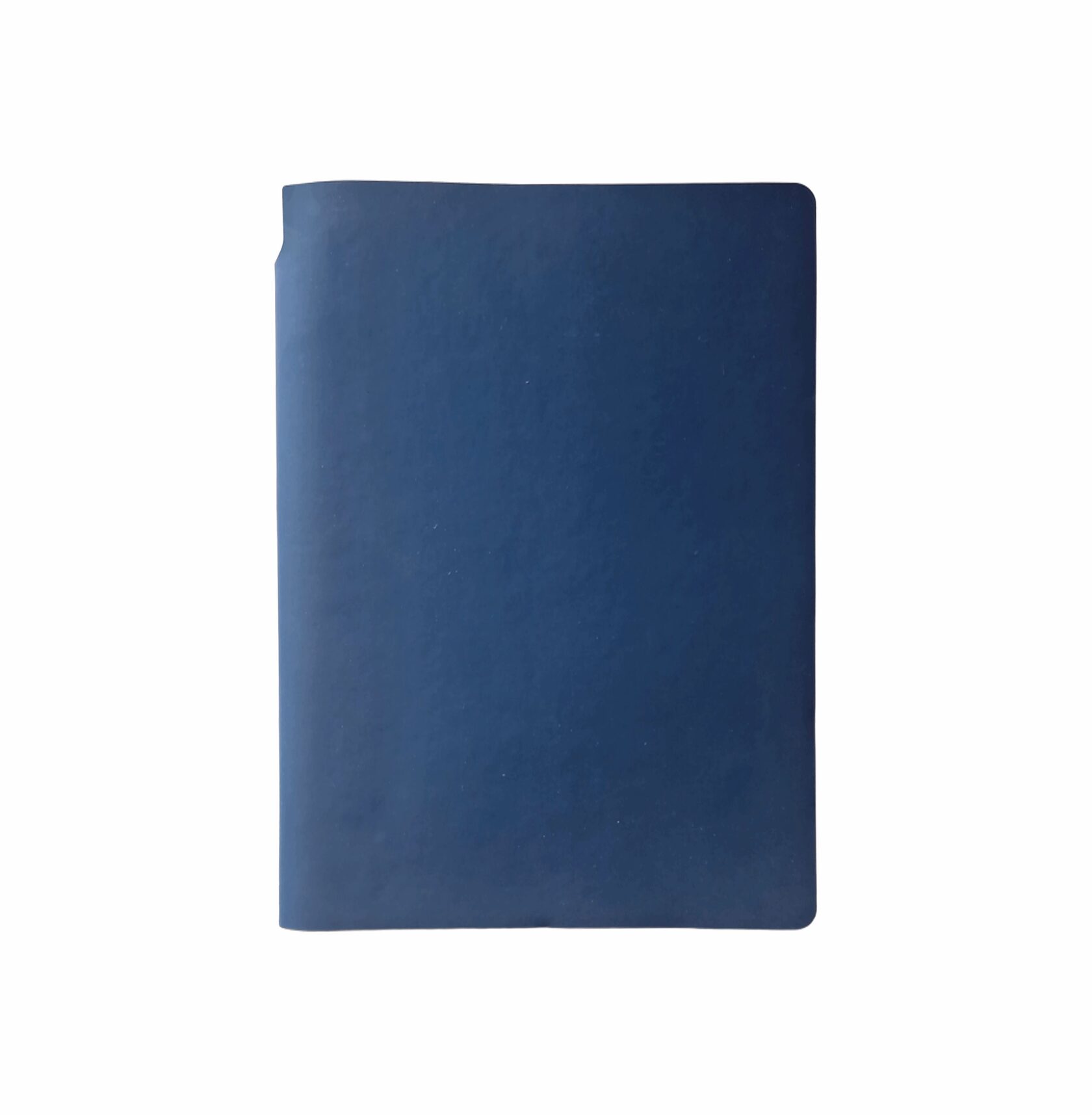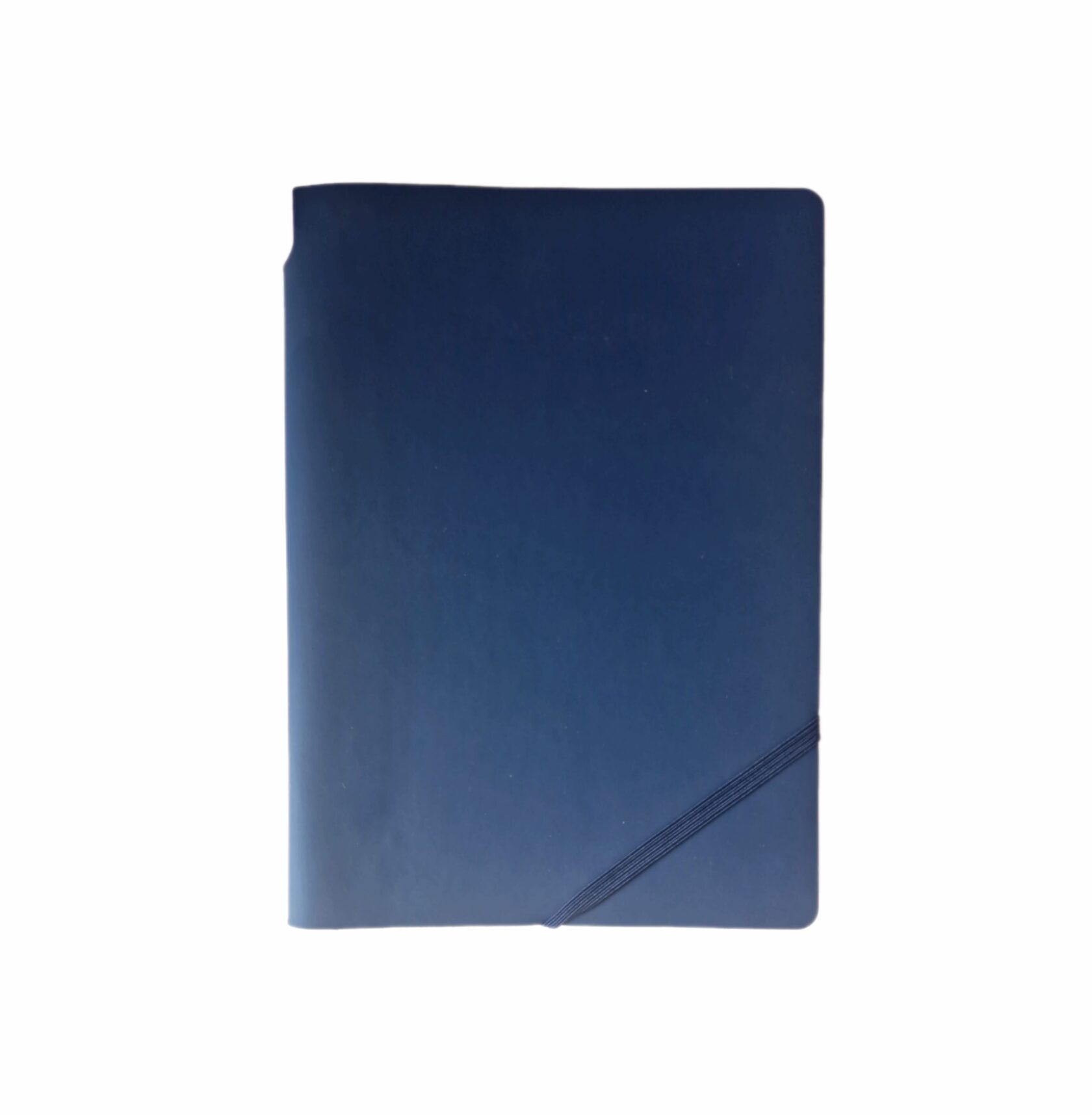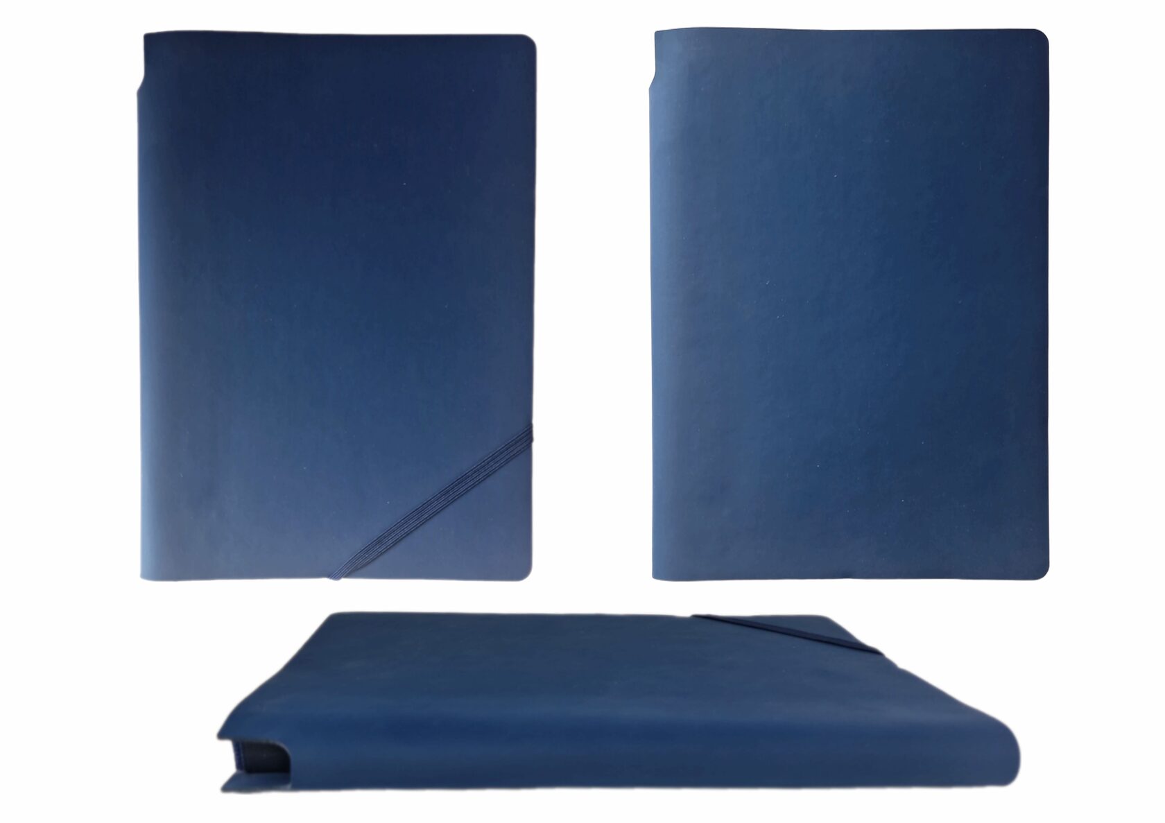 Гибкий ежедневник из экокожи может быть оснащен резинкой для удобства закрытия (по желанию Заказчика). Представлен из искусственной кожи софт-тач синего цвета. Имеются в наличии и под заказ основные цвета в ассортименте, а также различные оттенки и фактуры. Увеличенный корешок имеет углубление для ручки. Блок состоит из тонированных страниц бежевого цвета в клетку (черная графика). Каптал-ляссе, резинка (при необходимости) подобраны в цвет экокожи.