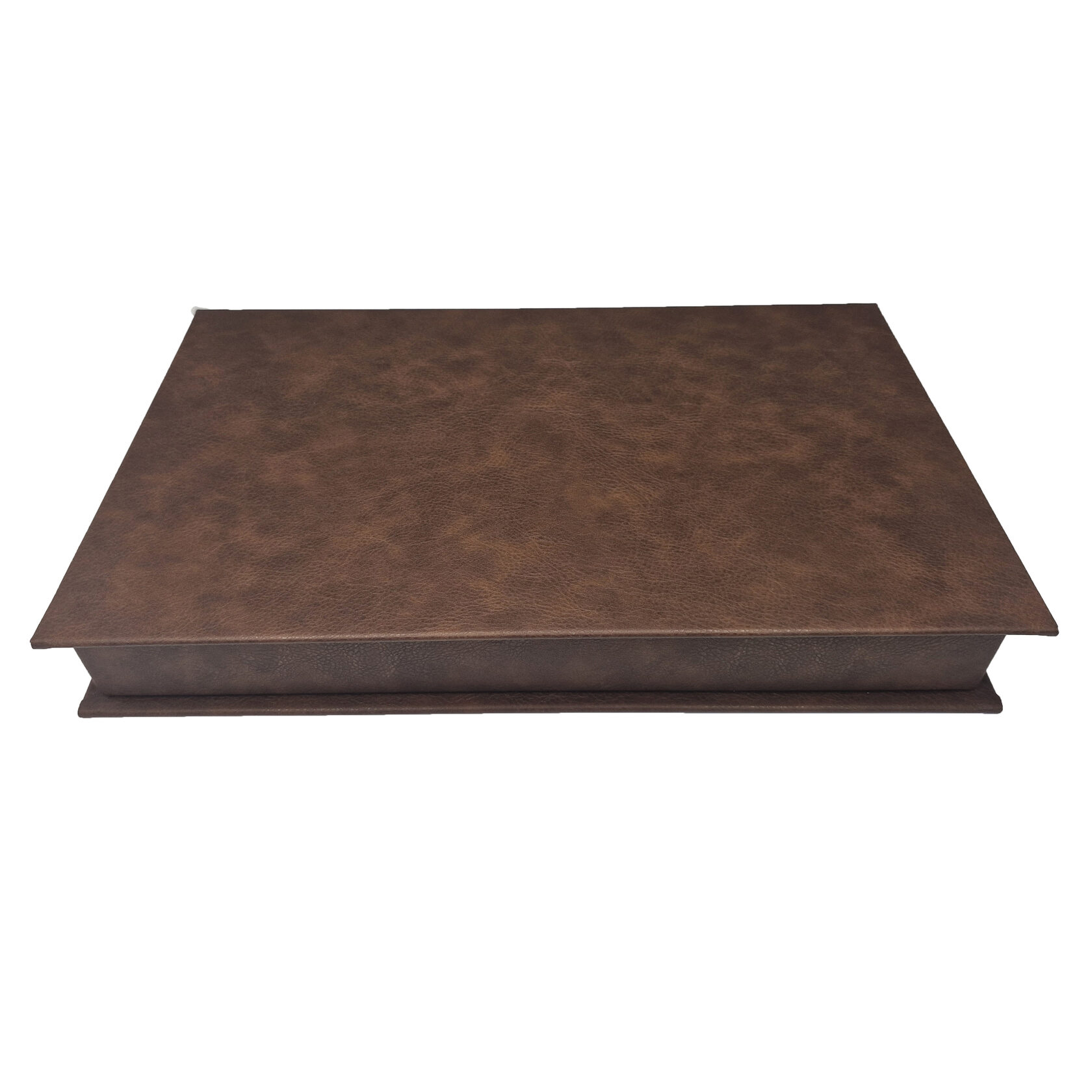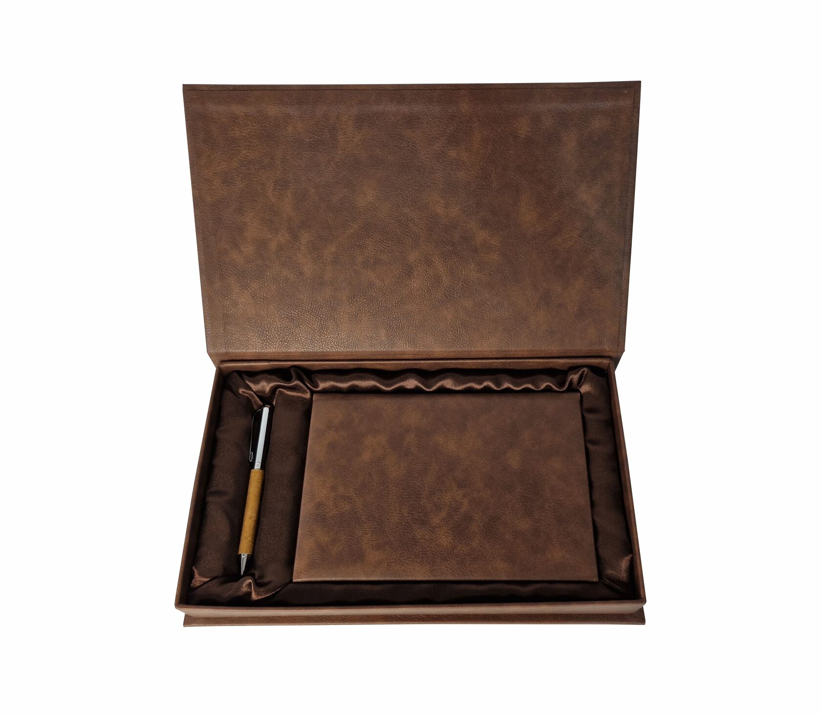 Размер: 33х20х4 см. Коробка без магнитного клапана, с увеличенной крышкой в форме книги. Объемный ложемент с атласом удерживает предметы внутри подарочной коробки и подчеркивает изысканный внешний вид изделий, собранных в наборе. Ежедневник А5 и подарочная коробка выполнена из одинаковой экокожи, что визуально создает комплект и взаимосвязь каждого предмета в наборе.
