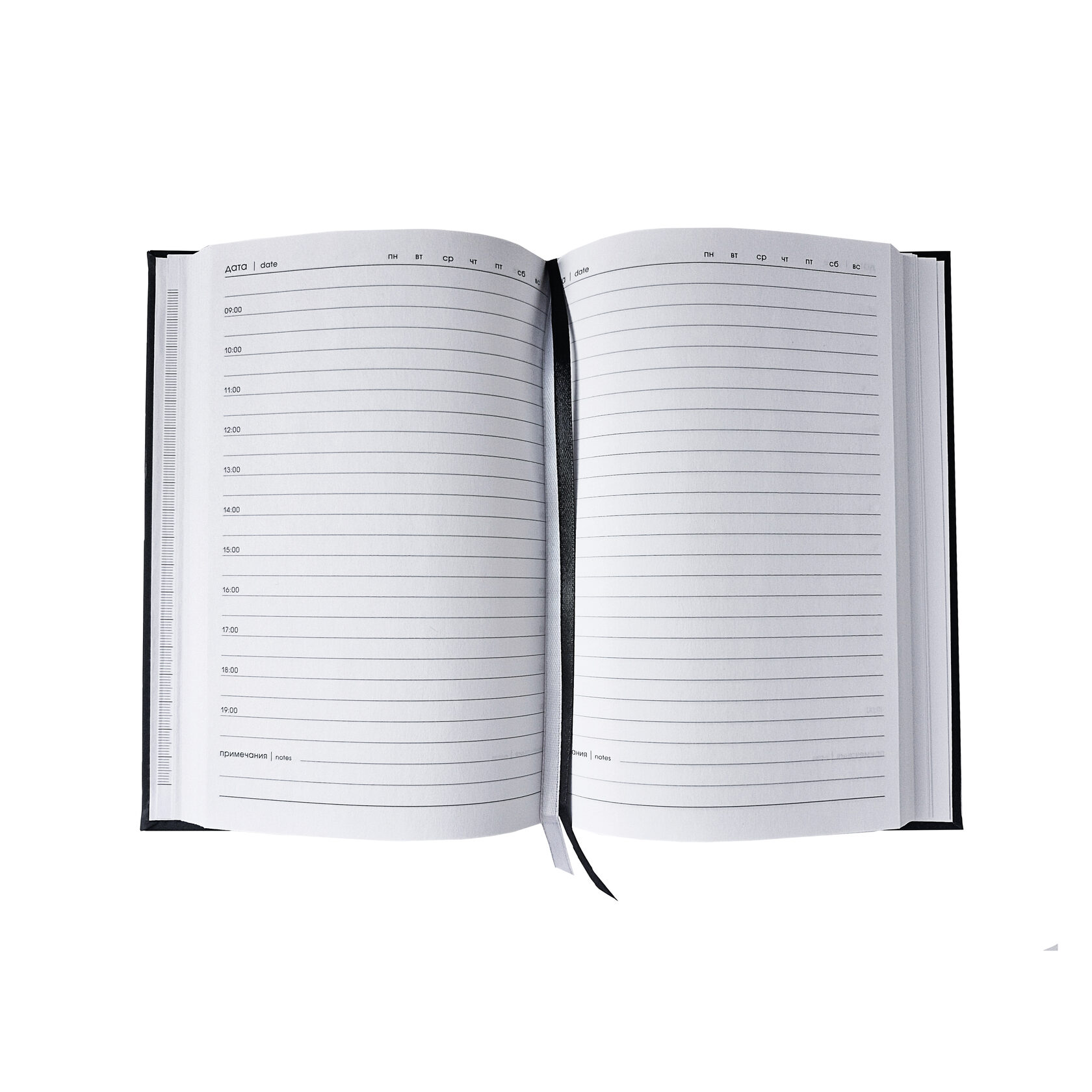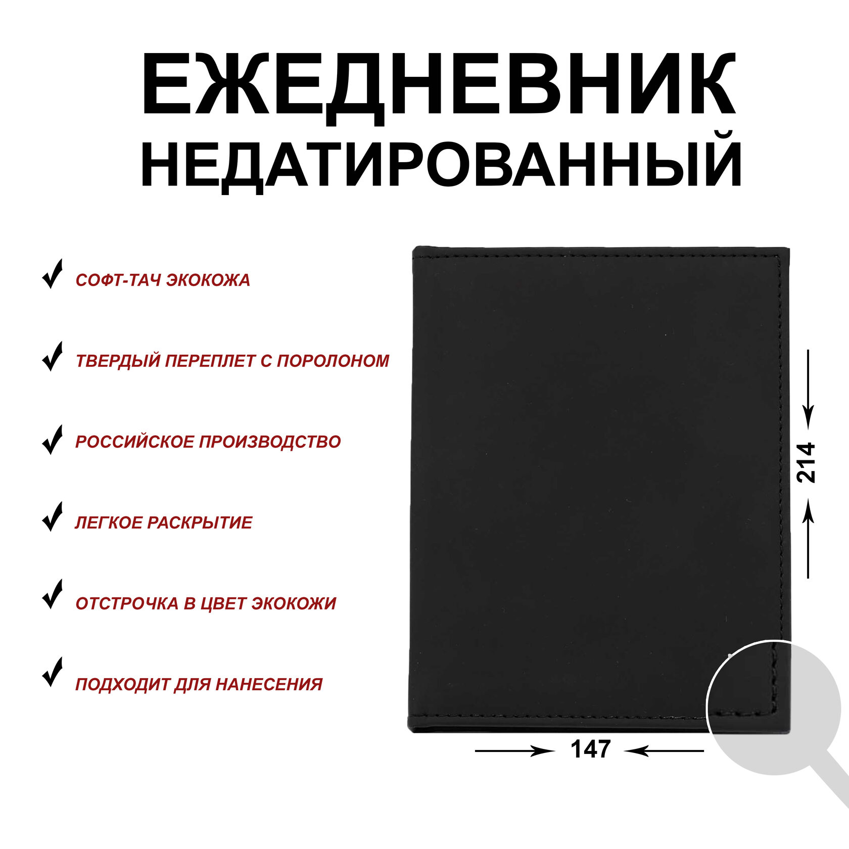 Обложка выполнена из искусственной кожи с модным покрытием софт-тач с монохромной отстрочкой по периметру. Черный цвет подчеркивает силу его владельца. 2 атласных ляссе придают дополнительные возможности для записи важной информации. Блок состоит из 256 страниц белого цвета с черной графикой (офсетная печать, листы 70 г/м2), оснащен информационно-справочным разделом.